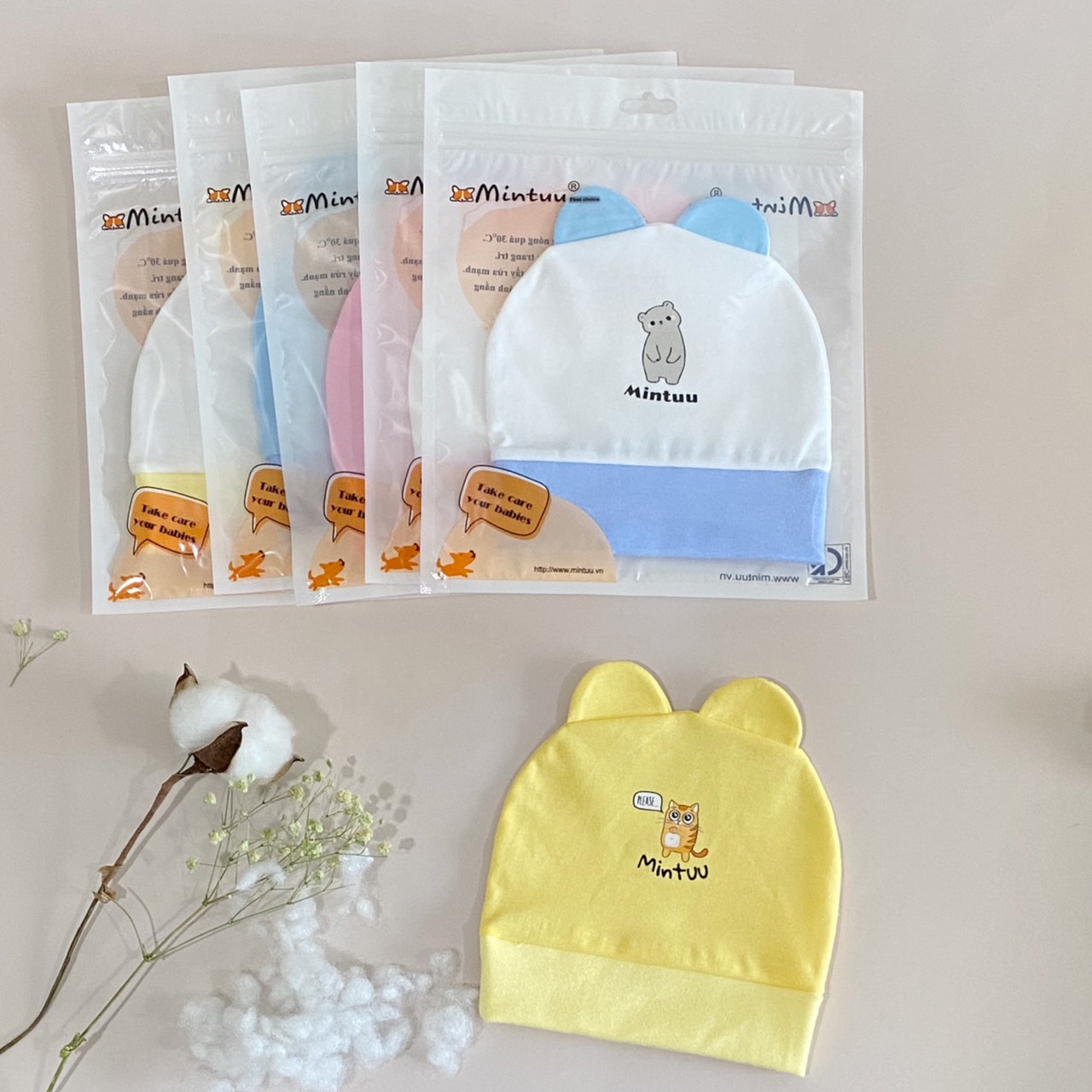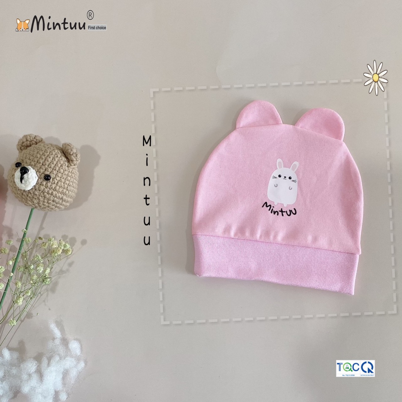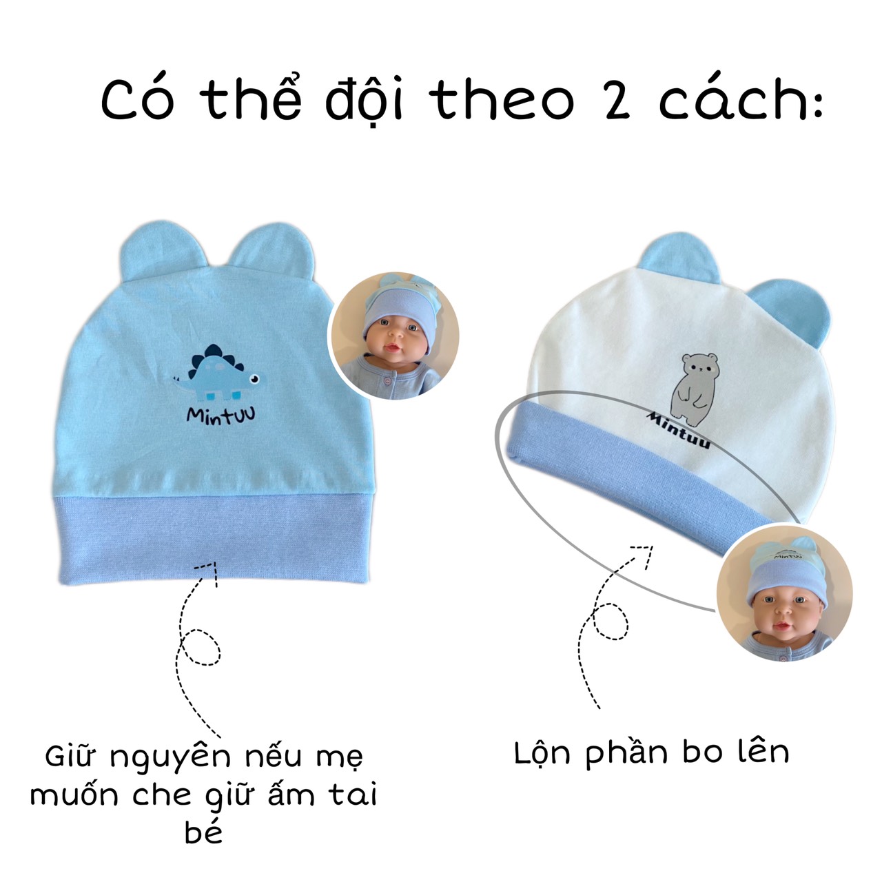 | * Thiết kế: Mũ cách điệu có 2 tai, viền mũ bo tròn, ôm nhẹ phần đầu của bé, giúp chắn gió cho vùng thóp |