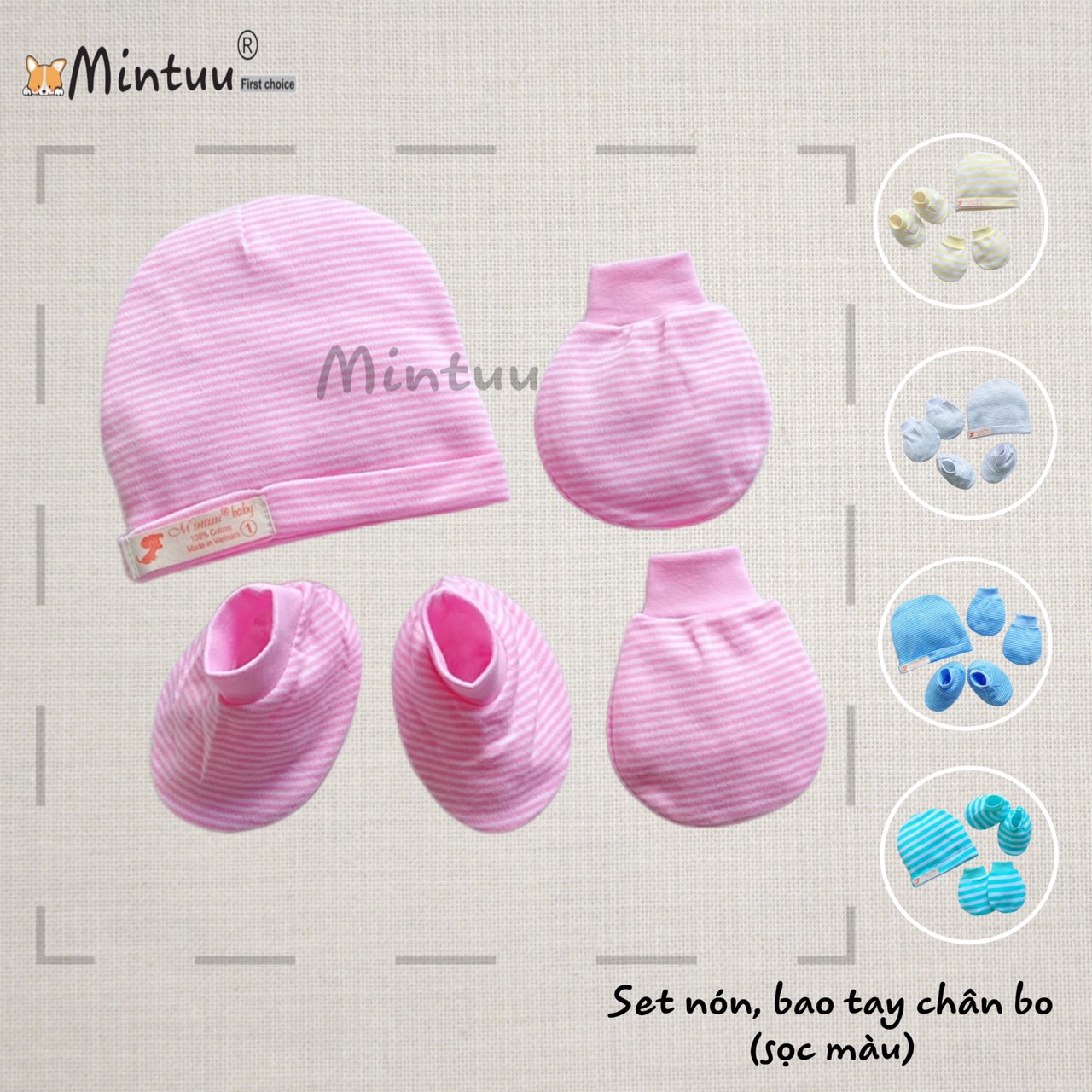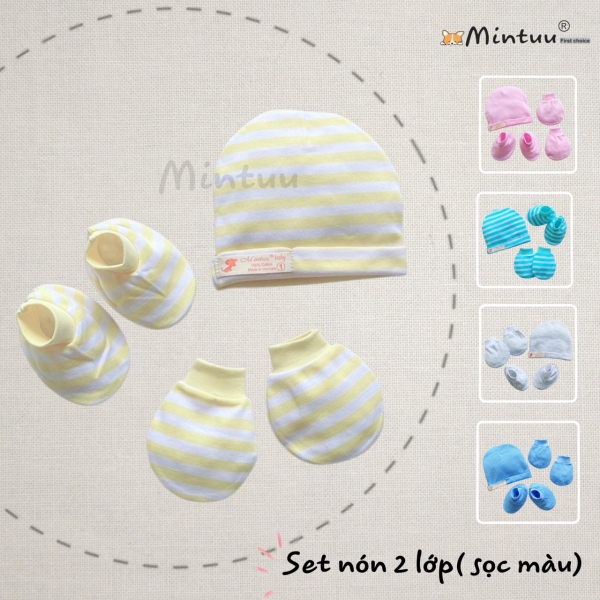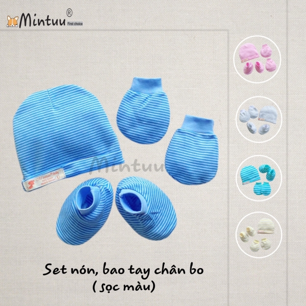 | * Chất liệu: Set mũ - tay chân được sản xuất từ chất liệu vải Interlock sọc màu cao cấp, mềm mại, co giãn tốt, không gây dị ứng cho làn da non nớt của bé. |