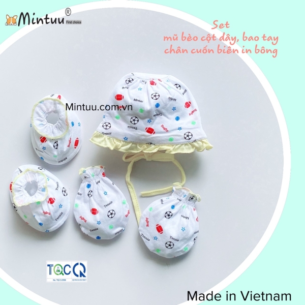 | * Sản phẩm gồm: 1 chiếc mũ bèo cột dây, 1 bộ tay chân cuốn biên in bông (2 tay + 2 chân) |